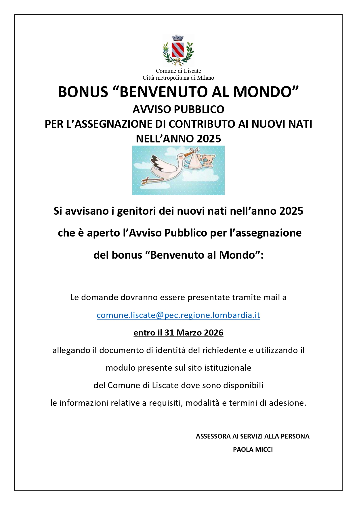 Assegnazione di contributi ai nuovi nati – Bonus “Benvenuto al mondo” anno 2025 – Scadenza: martedì 31 marzo 2026