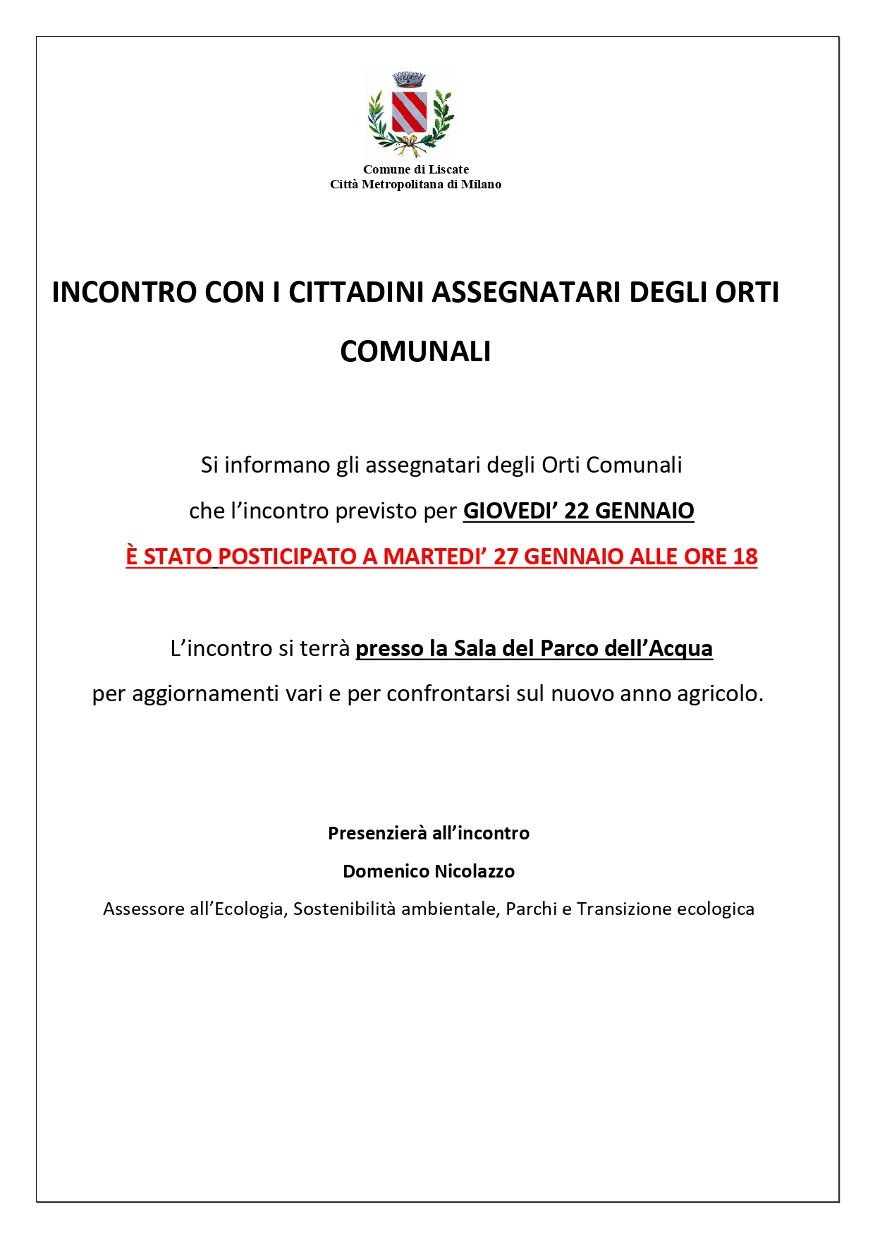 INCONTRO CON I CITTADINI ASSEGNATARI DEGLI ORTI COMUNALI – Martedì 27 gennaio 2026 ore 18,00 presso la Casa dell’Acqua