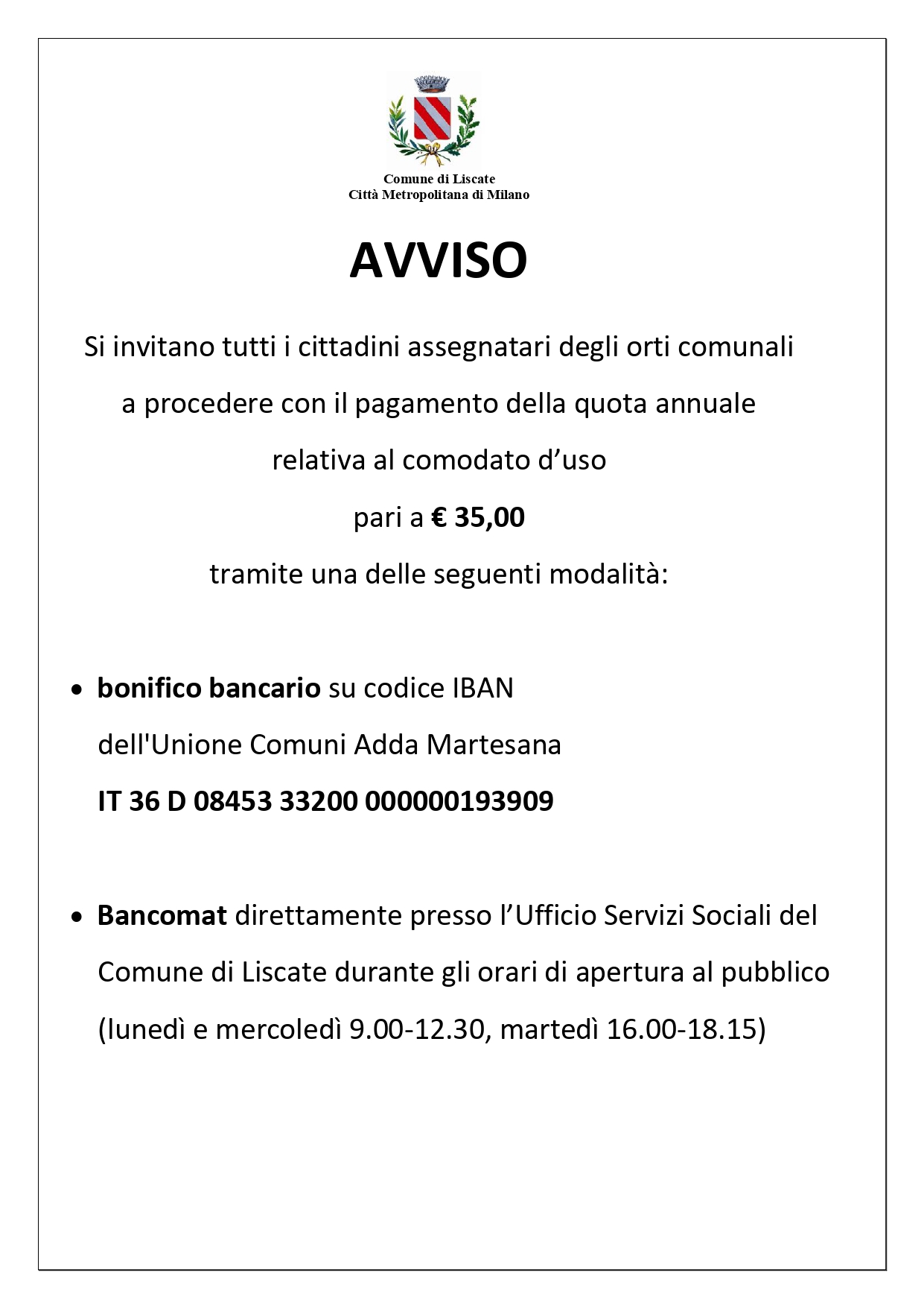 AVVISO DI PAGAMENTO QUOTA ANNUALE ORTI URBANI