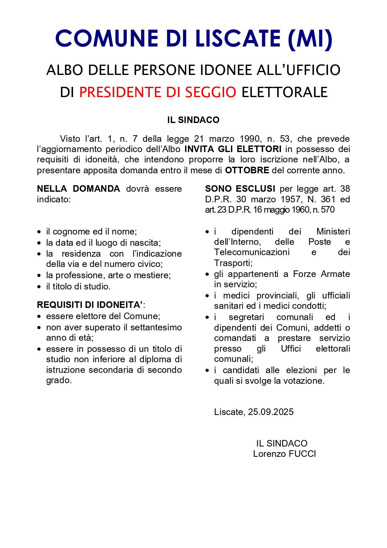Iscrizione nell’ALBO delle Persone idonee all’Ufficio di PRESIDENTE di SEGGIO ELETTORALE – PRESENTAZIONE Domande ENTRO il 31 ottobre 2025.