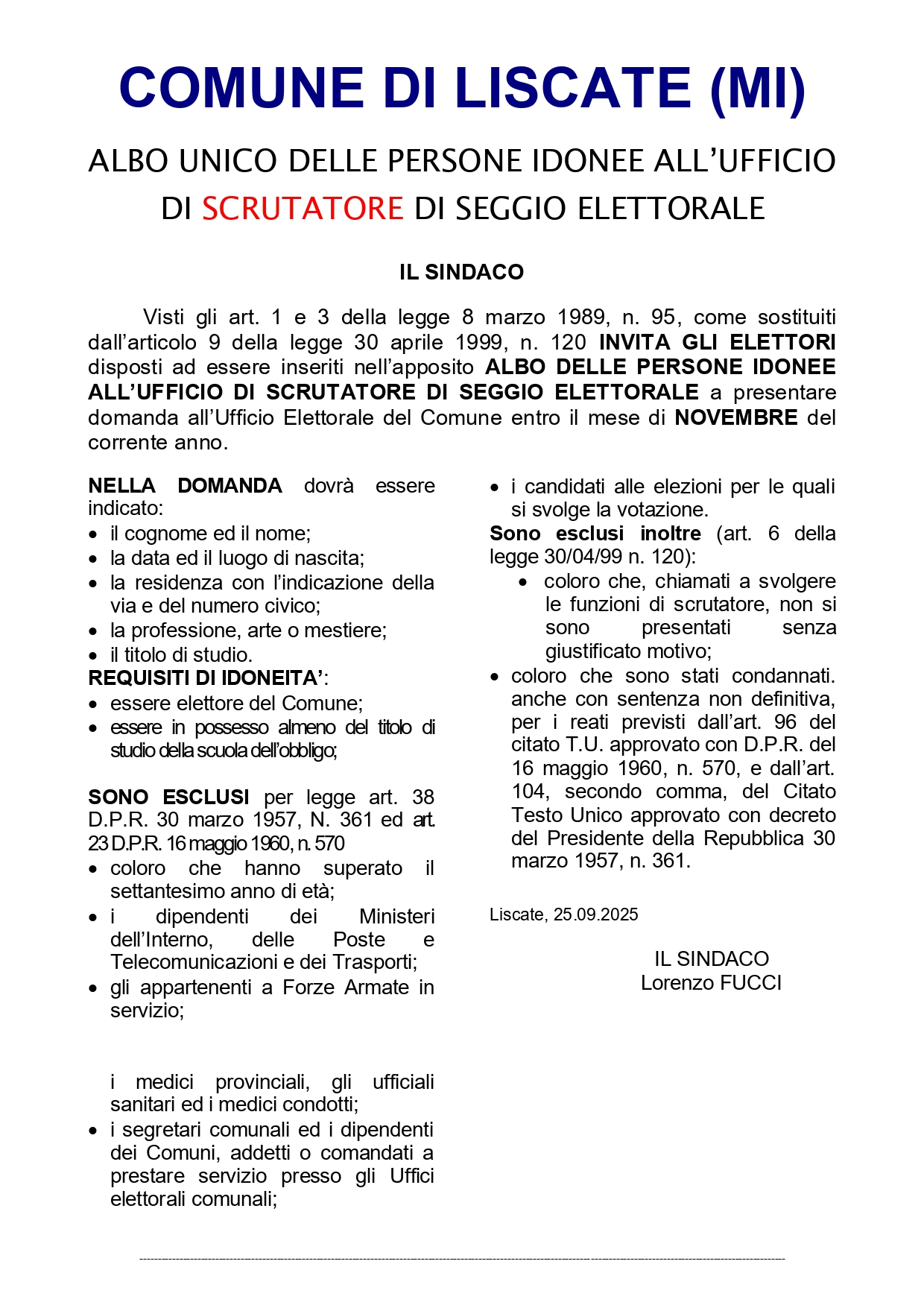 ISCRIZIONE nell’ ALBO UNICO DELLE PERSONE IDONEE all’UFFICIO DI SCRUTATORE DI SEGGIO ELETTORALE presentazione Domande ENTRO il 30 Novembre 2025.