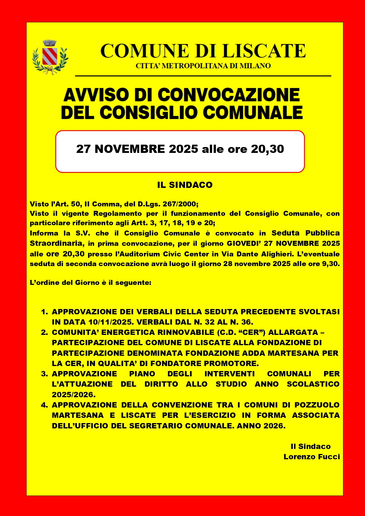 CONSIGLIO COMUNALE – Giovedì 27 novembre 2025 alle ore 20,30 nella Sala Auditorium presso il Civic Center Liscate