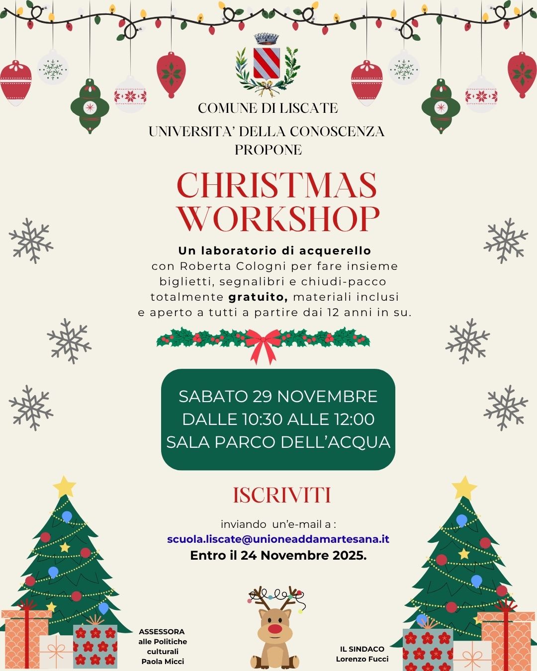 L’Università della Conoscenza propone “CHRISTMAS WORKSHOP” (Laboratorio di Natale) – Sabato 29 novembre dalle 10,30 alle 12,00 presso la Casa dell’Acqua di Liscate – GRATUITO
